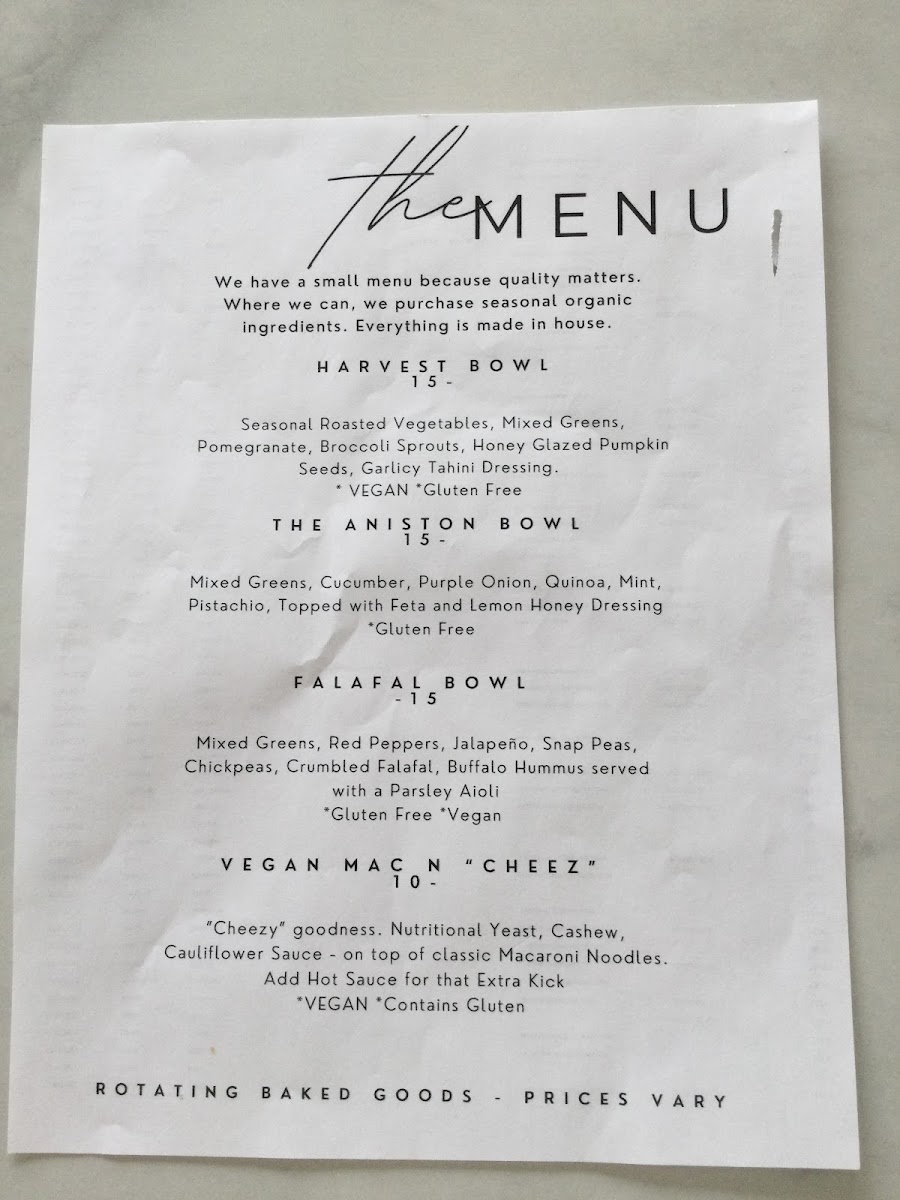 The menu features an array of thoughtfully curated items, including heartwarming smoothies like the Berry Happy and wholesome bowls such as the Harvest and Falafel Bowls. Not just salads and smoothies, the cafe also delights with unique offerings like the Vegan Mac N "Cheez and gourmet chocolate treats made with organic ingredients.